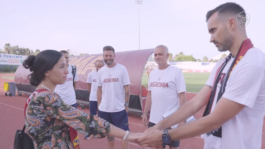 Οι «τζαλορόσι» αυτές τις μέρες βρίσκονται για προετοιμασία στην Αλμπουφέιρα του Αλγκάρβε στη νότια Πορτογαλία κι ένας Πορτογάλος οπαδός της Ρόμα συνοδευόμενος από τη μνηστή του επισκέφθηκαν μια από τις προπονήσεις της ομάδας και στο τέλος της θέλησαν να βγουν φωτογραφίες με τον Ζοσέ Μουρίνιο.